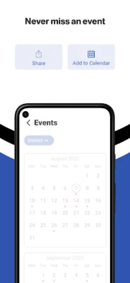 NEVER MISS AN EVENT The event section shows a list of events throughout the district. Users can add an event to their calendar and share the event with friends and family with one tap.